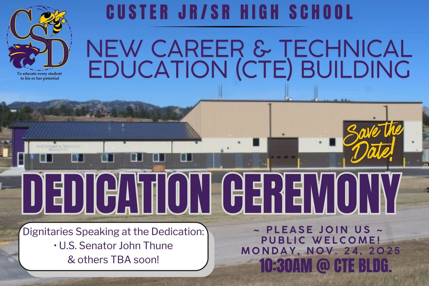 Senator Thune’s visited Custer School District for the grand opening of their new CTE building. Funds for this new building were provided in part through impact aid.
